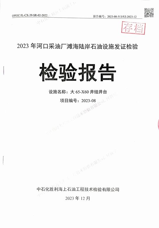 报告名称 | 2023年河口采油厂滩海陆岸石油设施发证检验检验报告(大65-X60井组井台) |