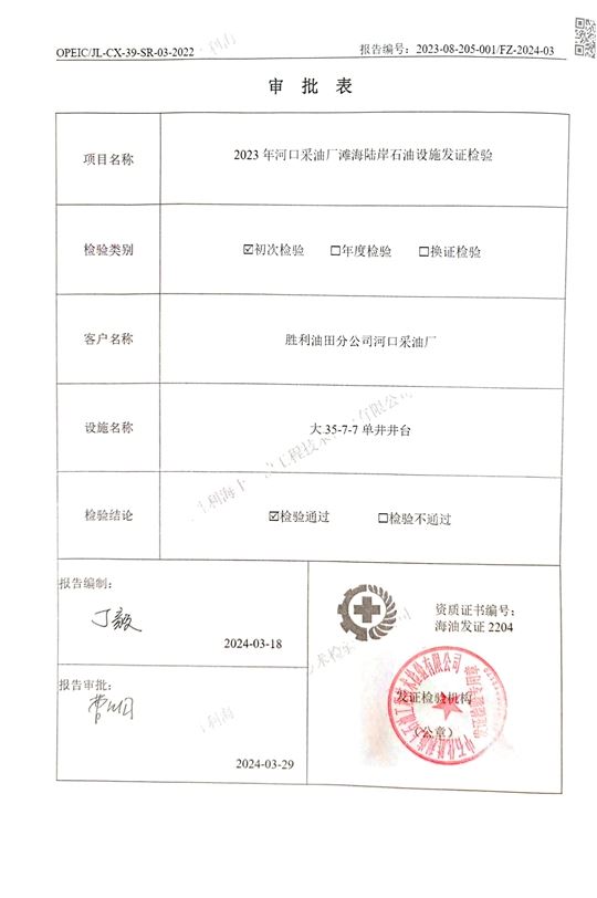 报告名称 | 2023年河口采油厂滩海陆岸石油设施发证检验检验报告(大35-7-7单井井台) |