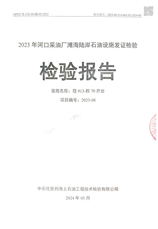 报告名称 | 2023年河口采油厂滩海陆岸石油设施发证检验检验报告(埕913-斜70井台) |