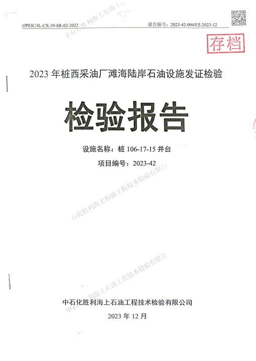 报告名称 | 2023年桩西采油厂滩海陆岸石油设施发证检验检验报告(桩106-17-15井台) |