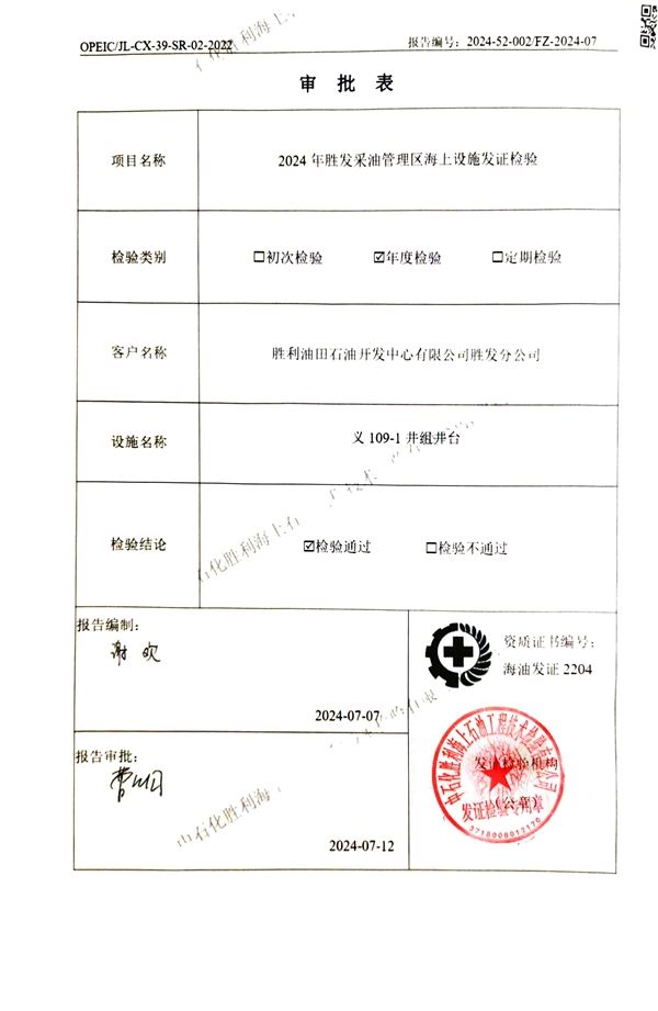 检测检验单位 | 中石化胜利海上石油工程技术检验有限公司 |