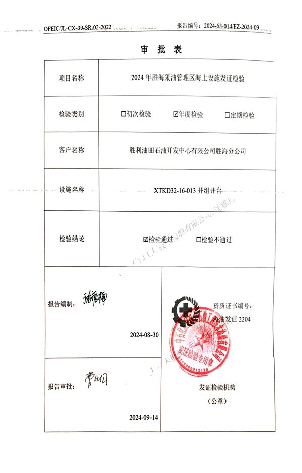 报告名称 | 2024年胜海采油管理区海上设施发证检验(XTKD32-16-013井组井台) |
