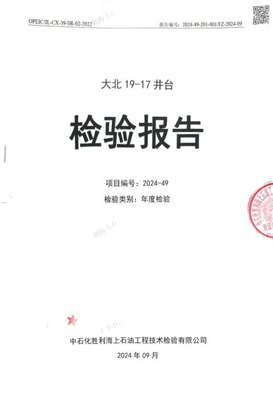 报告名称 | 2024年河口采油厂滩海陆岸石油设施发证检验(大北19-17井台检验报告) |