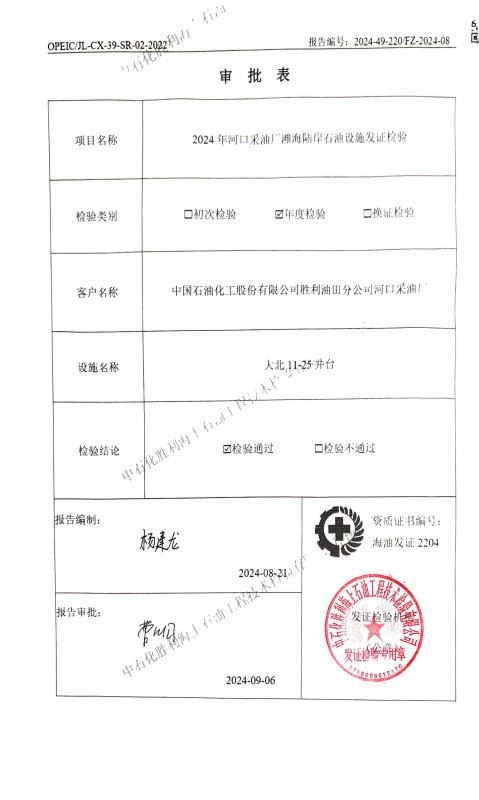 报告名称 | 2024年河口采油厂滩海陆岸石油设施发证检验(大北11-25井台检验报告) |
