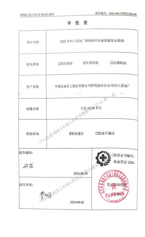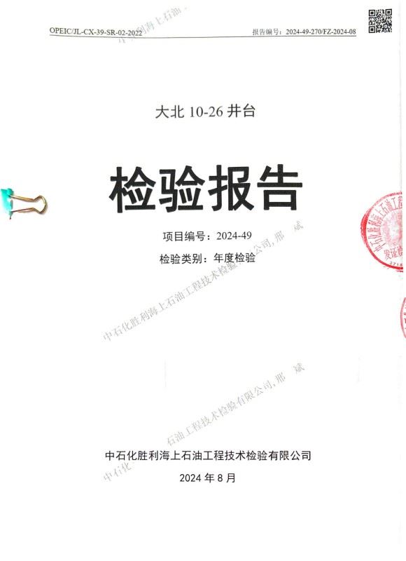 报告名称 | 2024年河口采油厂滩海陆岸石油设施发证检验(大北10-26井台检验报告) |