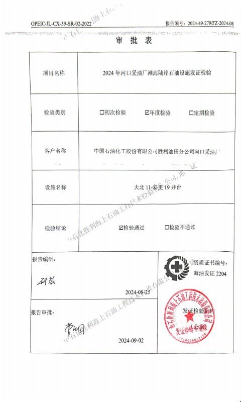 报告名称 | 2024年河口采油厂滩海陆岸石油设施发证检验(大北11-斜更19井台检验报告) |
