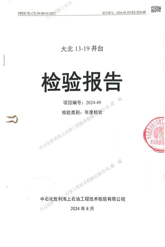 报告名称 | 2024年河口采油厂滩海陆岸石油设施发证检验(大北13-19井台检验报告) |