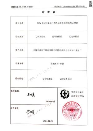 报告名称 | 2024年河口采油厂滩海陆岸石油设施发证检验(埕126-3-7井台) |