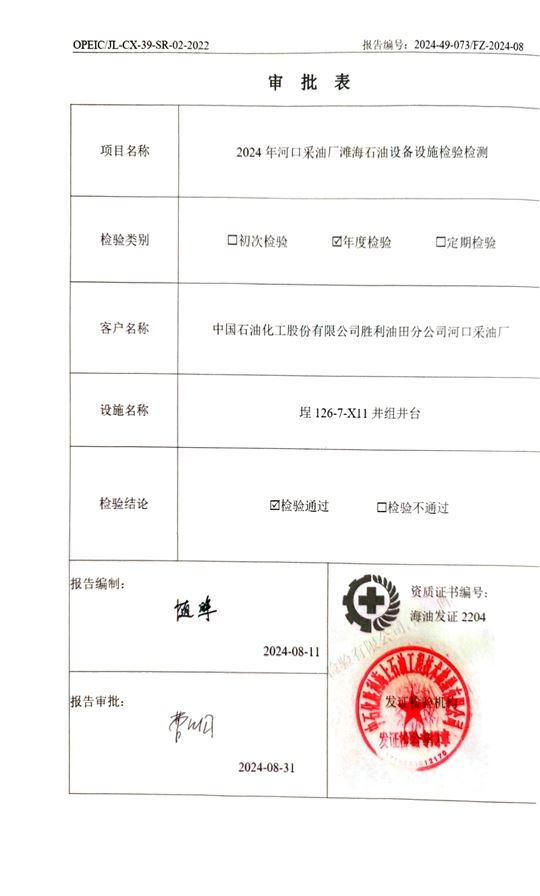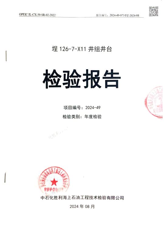 报告名称 | 2024年河口采油厂滩海陆岸石油设施发证检验(埕126-7-X11井组井台) |
