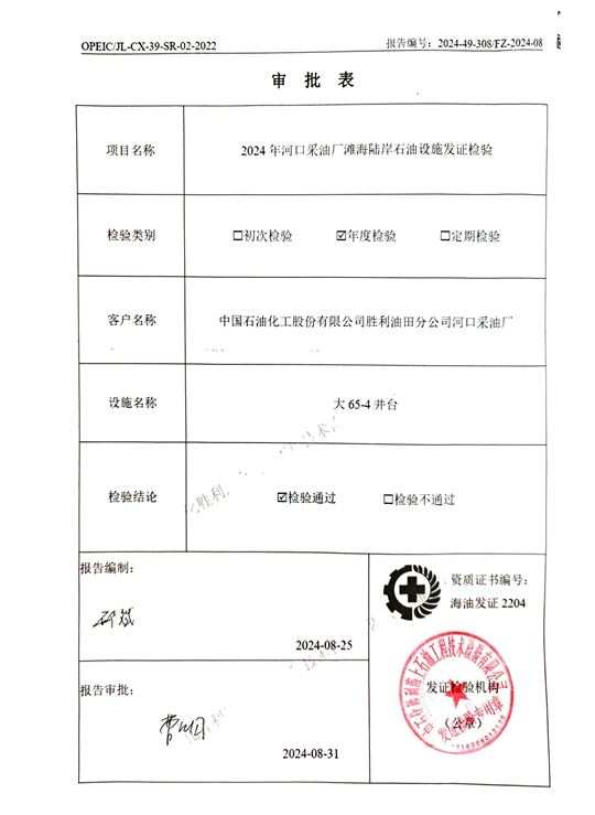 报告名称 | 2024年河口采油厂滩海陆岸石油设施发证检验(大65-4井台) |