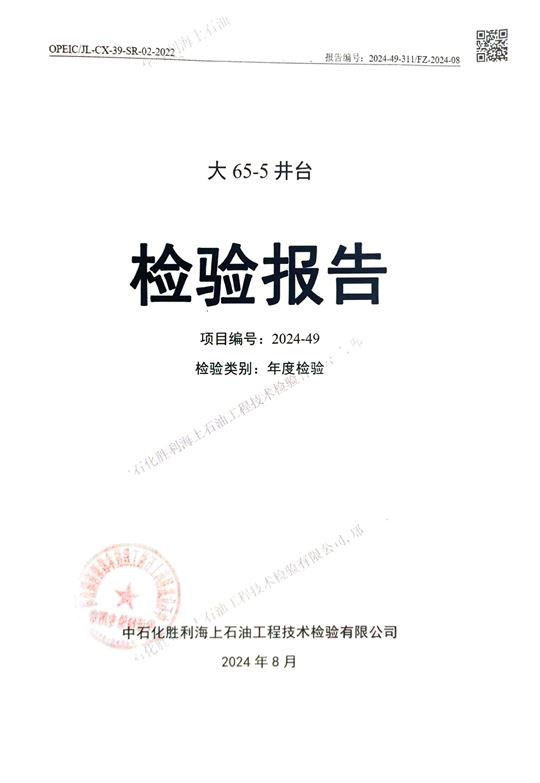 报告名称 | 2024年河口采油厂滩海陆岸石油设施发证检验(大65-5井台) |