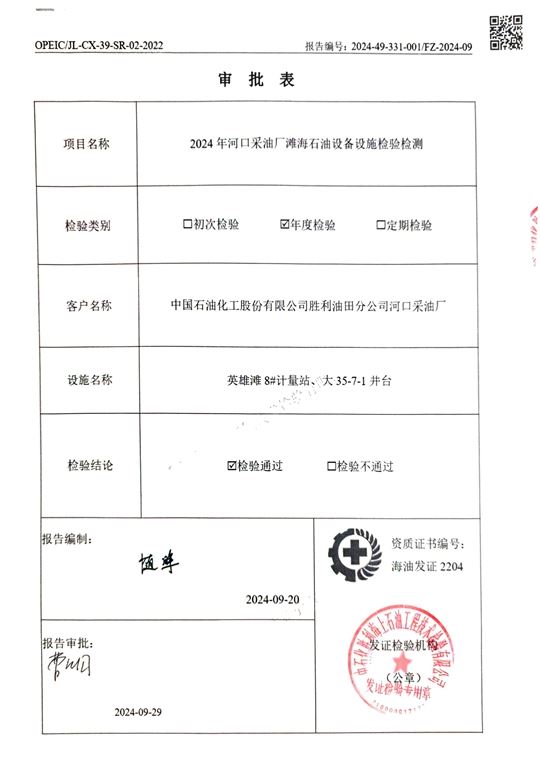 2024年河口采油厂滩海陆岸石油设施发证检验