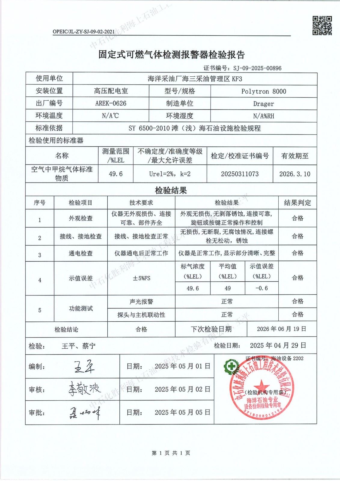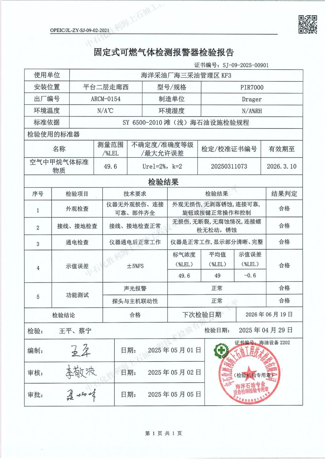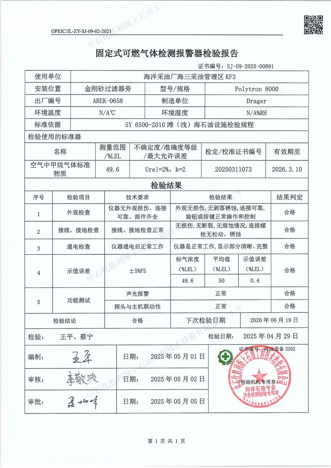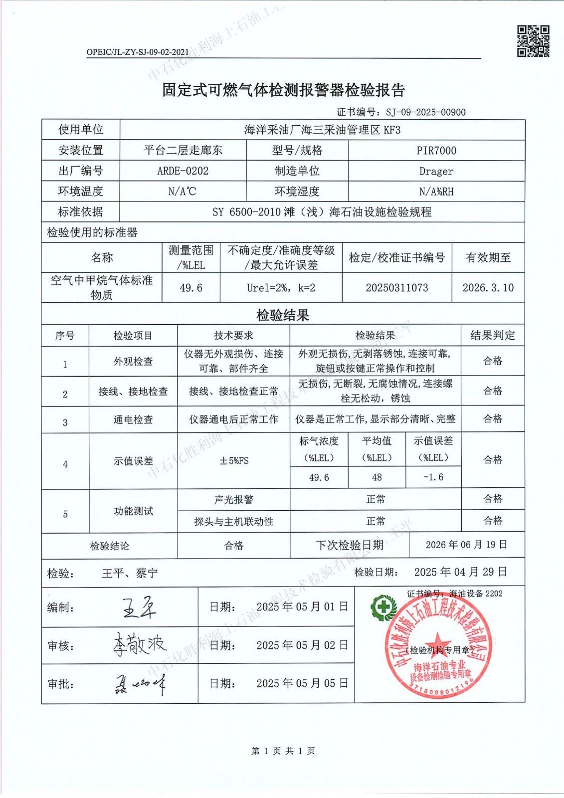 2、检验内容:报警控制器检验,固定式可燃气体检测报警器检验,固定式硫化氢气体检测仪检验,火灾探测器(感温)检验,火灾探测器(感烟)检验,手动火灾报警按钮检验,火灾探测器(火焰)