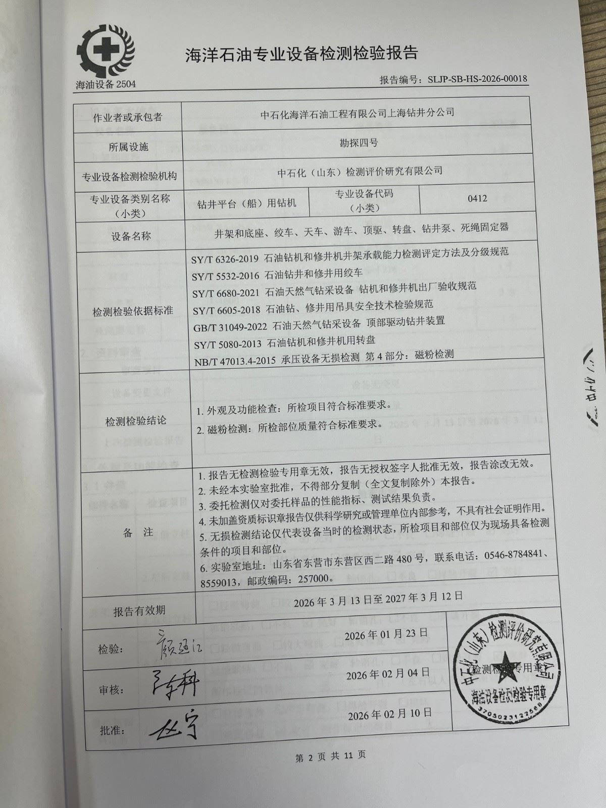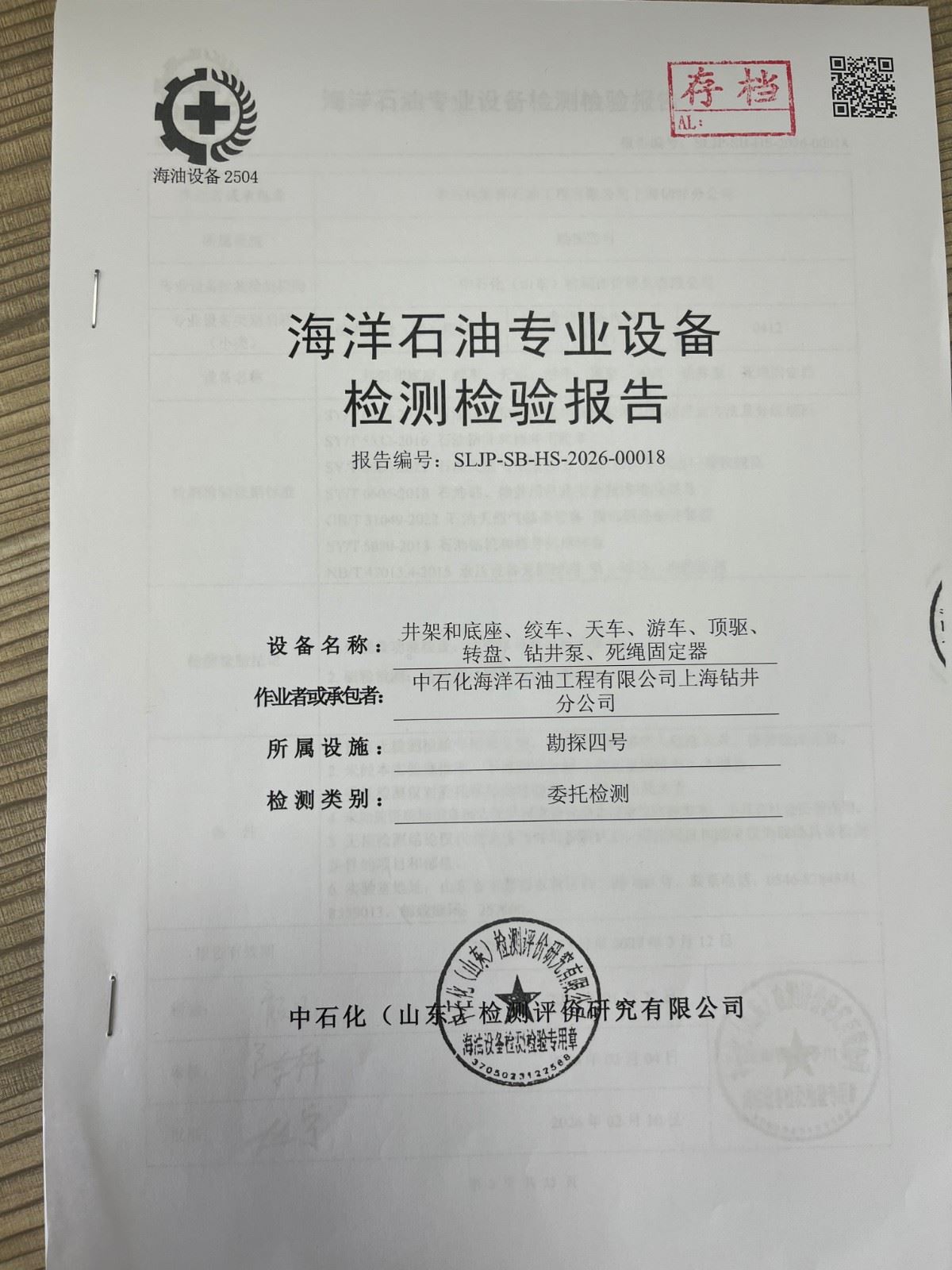 报告名称 | 中石化海洋石油工程有限公司上海钻井分公司勘探四号钻机年检 | |