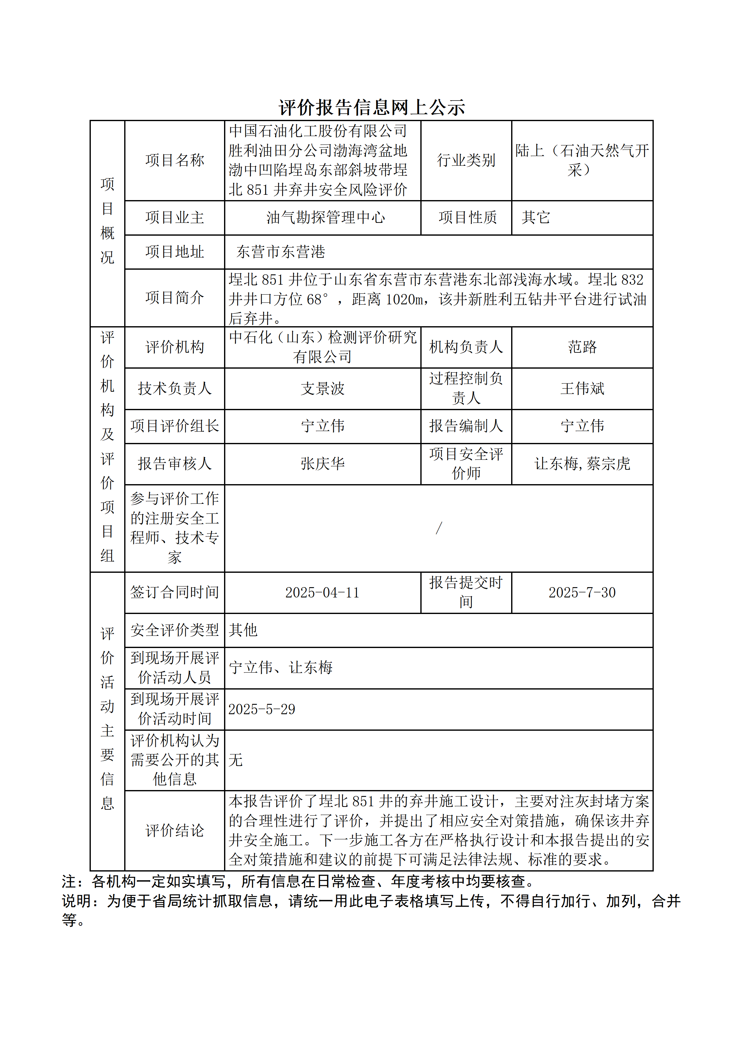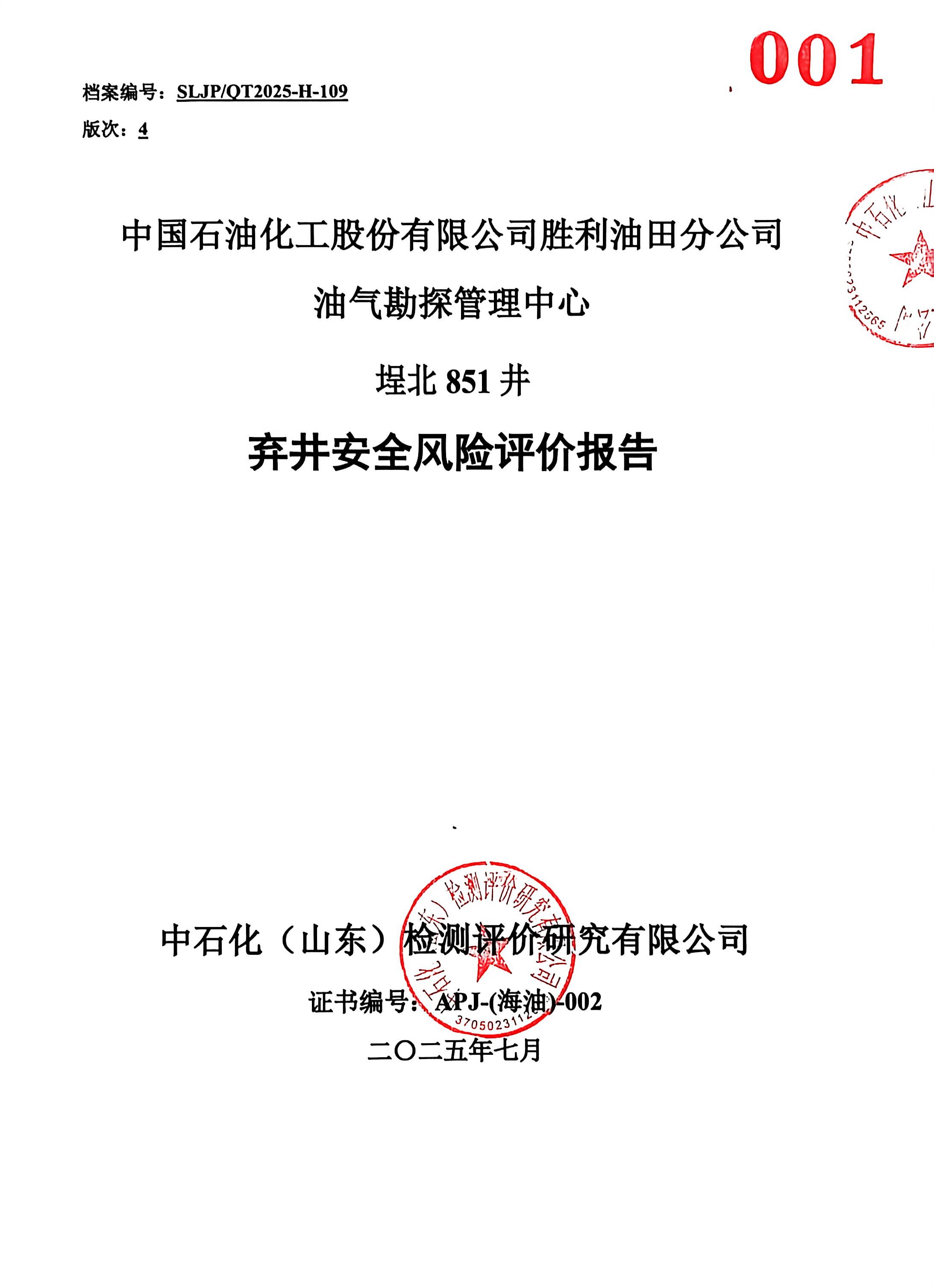 中国石油化工股份有限公司胜利油田分公司渤海湾盆地渤中凹陷埕岛东部斜坡带埕北851井弃井安全风险评价
